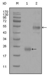 - Western blot analysis using CD44 mouse mAb against truncated Trx-CD44 recombinant protein (1) and GST-CD44 (aa628-699) recombinant protein (2).
