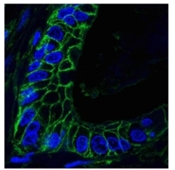 - Confocal analysis of paraffin-embedded human lung cancer tissues using CD44 mouse mAb (green), showing membrane localization. Blue: DRAQ5 fluorescent DNA dye.