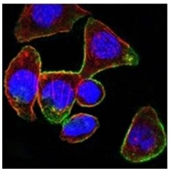 - Confocal immunofluorescence analysis of PANC-1 cells using CD44 mouse mAb (green). Red: Actin filaments have been labeled with DY-554 phalloidin. Blue: DRAQ5 fluorescent DNA dye.
