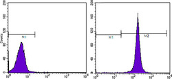 - Flow cytometric analysis of Hela cells using CD44 monoclonal antibody (right) and negative control (left).
