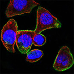 - Confocal immunofluorescence analysis of PANC-1 cells using CD44 monoclonal antibody (green). Red: Actin filaments have been labeled with DY-554 phalloidin. Blue: DRAQ5 fluorescent DNA dye.