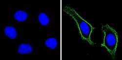 - Immunofluorescent analysis of CD44 Std (green) showing staining in the membrane of Hela cells (right) compared to a negative control without primary antibody (left). Formalin-fixed cells were permeabilized with 0.1% Triton X-100 in TBS for 5-10 minutes and blocked with 3% BSA-PBS for 30 minutes at room temperature. Cells were probed with a CD44 Std monoclonal antibody (Product # MA5-13890) in 3% BSA-PBS at a dilution of 1:100 and incubated overnight at 4 ºC in a humidified chamber. Cells were washed with PBST and incubated with a DyLight-conjugated secondary antibody in PBS at room temperature in the dark. F-actin (red) was stained with a fluorescent red phalloidin and nuclei (blue) were stained with Hoechst or DAPI. Images were taken at a magnification of 60x.