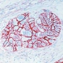 - Formalin-fixed, paraffin-embedded human esophageal carcinoma stained with CD44 antibody using peroxidase-conjugate and AEC chromogen. Note cell membrane staining of tumor cells.