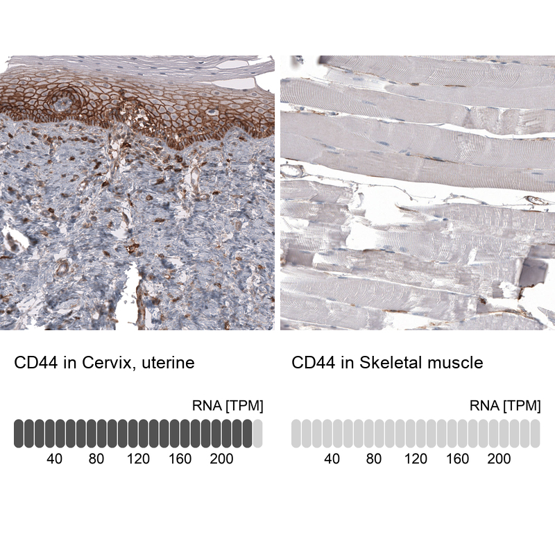 - Immunohistochemistry analysis in human cervix, uterine and skeletal muscle tissues using AMAb91845 antibody. Corresponding CD44 RNA-seq data are presented for the same tissues.