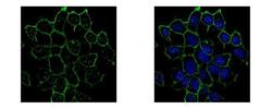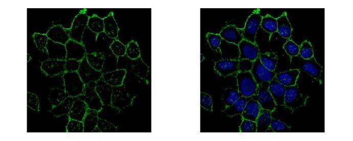 - CD44 antibody [GT981] detects CD44 protein at membrane by confocal immunofluorescent analysis. Sample: A431 cells were fixed in ice-cold MeOH for 5 min.Green: CD44 protein stained by CD44 antibody [GT981] (GTX628472) diluted at 1:500.Blue: Hoechst 33342 staining.[Images captured by Olympus FV10i Confocal Laser Scanning Microscope]