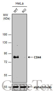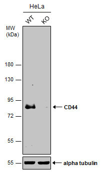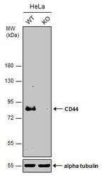 - Wild-type (WT) and CD44 knockout (KO) HeLa cell extracts (30 ?g) were separated by 7.5% SDS-PAGE, and the membrane was blotted with CD44 antibody [GT981] (GTX628472) diluted at 1:500.