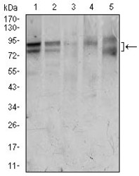 - Western blot using FOXP1 mouse monoclonal antibody against HeLa (1), Jurkat (2), MCF-7 (3), T47D (4), and Raw264.7 (5) cell lysate.