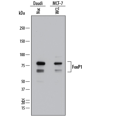 - Detection of Human FoxP1 by Western Blot. Western blot shows lysates of Daudi human Burkitt's lymphoma cell line and MCF-7 human breast cancer cell line. Gels were loaded with 25 µg of whole cell lysate (WCL) and 25 µg of nuclear extracts (Nuc). PVDF membrane was probed with 1 µg/mL of Mouse Anti-Human FoxP1 Monoclonal Antibody (Catalog # MAB45341) followed by HRP-conjugated Anti-Mouse IgG Secondary Antibody (Catalog # HAF018). Specific bands were detected for FoxP1 at approximately 65 and 80 kDa (as indicated). This experiment was conducted under reducing conditions and using Immunoblot Buffer Group 1.