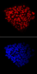 - FoxP1 in BG01V Human Embryonic Stem Cells. FoxP1 was detected in immersion fixed BG01V human embryonic stem cells using Mouse Anti-Human FoxP1 Monoclonal Antibody (Catalog # MAB45341) at 10 µg/mL for 3 hours at room temperature. Cells were stained using the NorthernLights™ 557-conjugated Anti-Mouse IgG Secondary Antibody (red, upper panel; Catalog # NL007) and counterstained with DAPI (blue, lower panel). Specific staining was localized to nuclei. View our protocol for Fluorescent ICC Staining of Stem Cells on Coverslips.