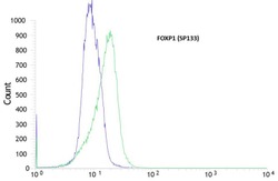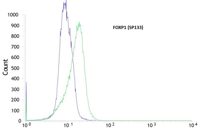- Flow Cytometric analysis of anti-FOXP1 Antibody Cat.-No AM33208PU (Clone SP133)Â in MOLT4 (green) compare to negative control of rabbit IgG (blue).