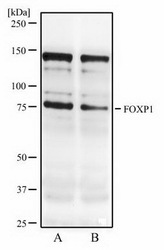 - Western Blot: FOXP1 Antibody (JC12) [TA336483] - Western blot analysis of resonicated MCF7 cell lysate (A) and MCF7 cell lysate (B) using FOXP1 antibody at 2 ug/ml.