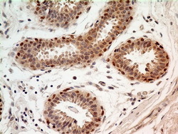 - Immunohistochemistry-Paraffin: FOXP1 Antibody (JC12) [TA336483] - IHC analysis of formalin-fixed paraffin-embedded tissue section of human normal breast using FOXP1 antibody (clone JC12) at 5 ug/ml concentration. The breast ductal/acinar epithelial cells