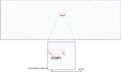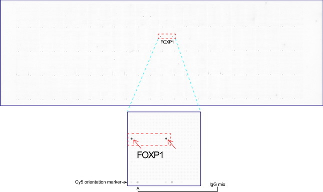 - OriGene overexpression protein microarray chip was immunostained with UltraMAB anti-FOXP1 mouse monoclonal antibody (UM800020). The positive reactive proteins are highlighted with two red arrows in the enlarged subarray. All the positive controls spotted in this subarray are also labeled for clarification.