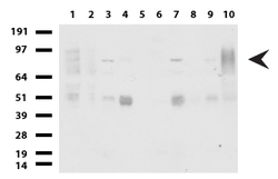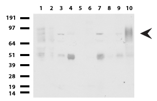 - Western blot of human tissue lysates (15ug) from 10 different tissues (1: Testis, 2: Omentum, 3: Uterus, 4: Breast, 5: Brain, 6: Liver, 7: Ovary, 8: Thyroid, 9: Colon, 10: Spleen ). Diluation: 1:500.