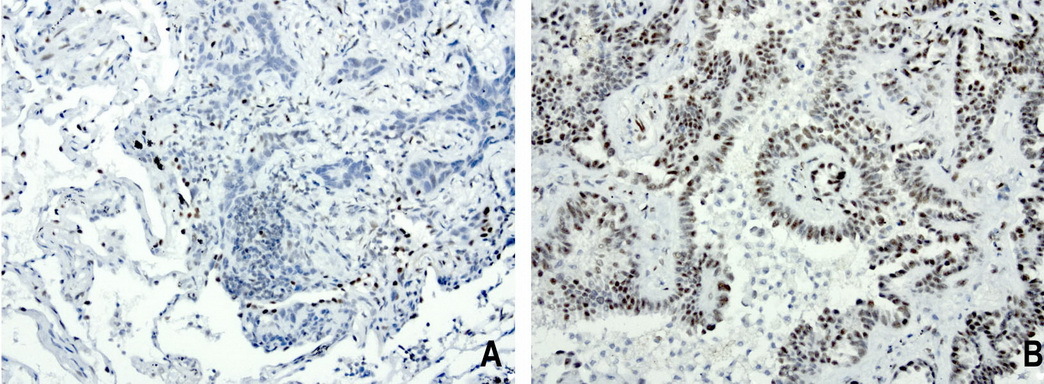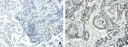 - Immunohistochemical staining of paraffin-embedded human lung cancer using anti-FOXP1 clone UMAB89 mouse monoclonal antibody at 1:200 dilution of 1.0 mg/mL using Polink2 Broad HRP DAB for detection. UM800020 requires HIER with with citrate pH6.0 at 110C for 3 min using pressure chamber/cooker. The panel A shows negative tumor cells of lung carcinoma and panel B strong nuclear staining in the tumor cells.