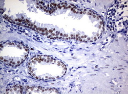 - Immunohistochemical staining of paraffin-embedded Human prostate tissue using anti-FOXP1 mouse monoclonal antibody. (UM800020; heat-induced epitope retrieval by 1 mM EDTA in 10mM Tris, pH8.0, 120C for 3min)