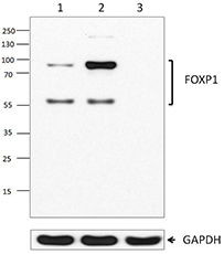 - Western blot analysis of cell lysates from HeLa (lane 1), Daudi (lane 2), and NIH3T3 (lane 3). Anti-FOXP1 antibody (clone O94D2) was used and followed by HRP anti-mouse IgG antibody. GAPDH (clone poly6314) was used as a loading control.