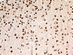 - Immunohistochemistry-Paraffin: FOXP1 Antibody (JC12) - IHC analysis of formalin-fixed paraffin-embedded tissue section of human normal brain using mouse monoclonal FOXP1 antibody (clone JC12) at 5 ug/ml concentration. The cells in the brain tissue depicted strong specific nuclear along with relatively weak cytoplasmic immunopositivity for FOXP1 protein.