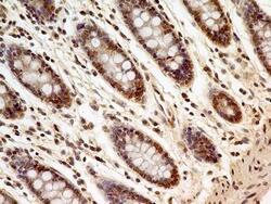 - Immunohistochemistry-Paraffin: FOXP1 Antibody (JC12) - IHC analysis of formalin-fixed paraffin-embedded tissue section of human normal colon using mouse monoclonal FOXP1 antibody (clone JC12) at 5 ug/ml concentration. Most of the cells depicted an expected strong nuclear with mild cytoplasmic staining.