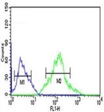 - FOXP1 antibody flow cytometric analysis of Ramos cells (right histogram) compared to negative control cells (left histogram). FITC-conjugated goat-anti-rabbit secondary Ab was used for the analysis.