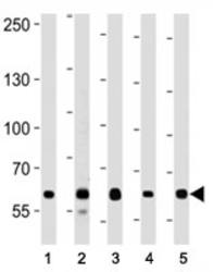 - FOXP1 antibody western blot analysis in (1) A549, (2) Daudi, (3) Jurkat, (4) MCF-7, and (5) NCI-H292 lysate