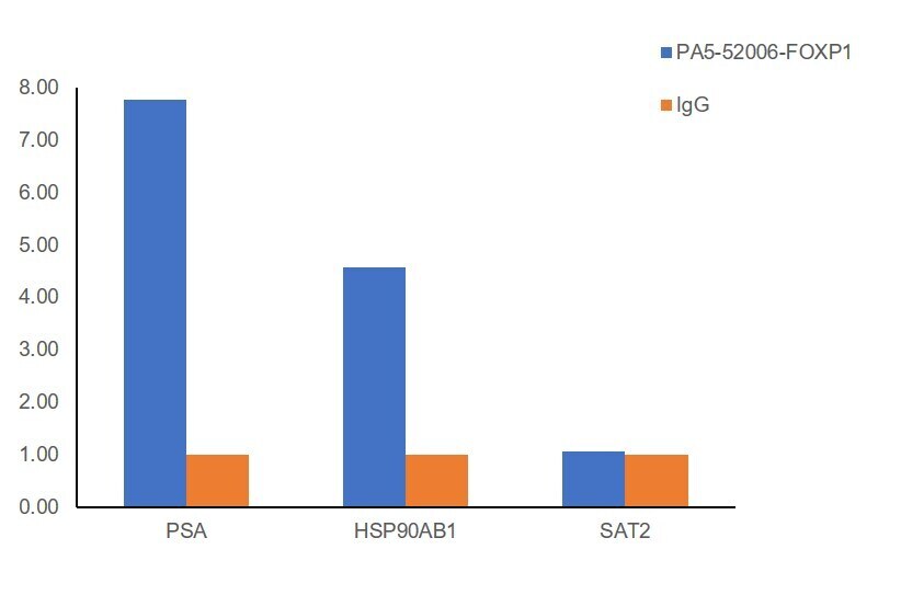 - Chromatin Immunoprecipitation (ChIP) assay of endogenous FOXP1 protein using FOXP1 Antibody: ChIP was performed using Anti-FOXP1 Polyclonal Antibody (Product # PA5-52006, 2.5 µg) on sheared chromatin from LnCaP cells using the MAGnify ChIP System kit (Product # 49-2024). Normal Rabbit IgG was used as a negative IP control. The purified DNA was analyzed by qPCR using primers binding to PSA, and HSP90AB1 (Active) and SAT2 satellite repeats (Inactive). Data is presented as fold enrichment of the antibody signal versus the negative control IgG using the comparative CT method.