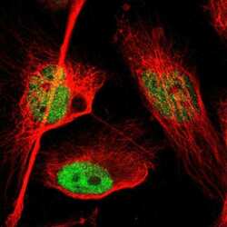- Immunofluorescent staining of FOXP1 in human cell line U-251 MG shows positivity in nucleus but excluded from the nucleoli. Samples were probed using a FOXP1 Polyclonal Antibody (Product # PA5-52006).