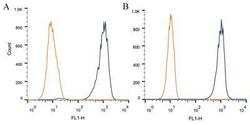 - Flow Cytometry: FOXP1 Antibody (JC12) [NB100-65125] - Intracellular flow cytometric staining of 1 x 10^6 CHO (A) and HeLa (B) cells using FOXP1 antibody (dark blue). Isotype control shown in orange. An antibody concentration of 1 ug/1x10^6 cells was used.
