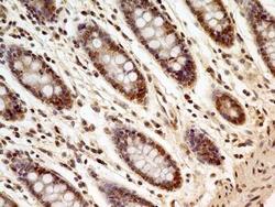 - Immunohistochemistry-Paraffin: FOXP1 Antibody (JC12) [NB100-65125] - IHC analysis of formalin-fixed paraffin-embedded tissue section of human normal colon using mouse monoclonal FOXP1 antibody (clone JC12) at 5 ug/ml concentration. Most of the cells depicted an expected strong nuclear with mild cytoplasmic staining.