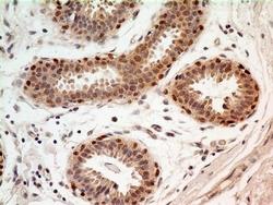 - Immunohistochemistry-Paraffin: FOXP1 Antibody (JC12) [NB100-65125] - IHC analysis of formalin-fixed paraffin-embedded tissue section of human normal breast using FOXP1 antibody (clone JC12) at 5 ug/ml concentration. The breast ductal/acinar epithelial cells and the myoepithelial cells developed a strong nuclear along with moderate cytoplasmic immuno-positivity for FOXP1 protein.