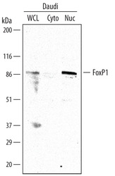 - Detection of Human FoxP1 by Western Blot. Western blot shows lysates of Daudi human Burkitt's lymphoma cell line. Gels were loaded with 30 μg of whole cell lysate (WCL), 20 μg of cytoplasmic (Cyto), and 10 μg of nuclear extracts (Nuc). PVDF membrane was probed with 1 µg/mL Goat Anti-Human FoxP1 Antigen Affinity-purified Polyclonal Antibody (Catalog # AF4534) followed by HRP-conjugated Anti-Goat IgG Secondary Antibody (Catalog # HAF017). A specific band for FoxP1 was detected at approximately 82 - 90 kDa (as indicated). This experiment was conducted under reducing conditions and using Immunoblot Buffer Group 1.